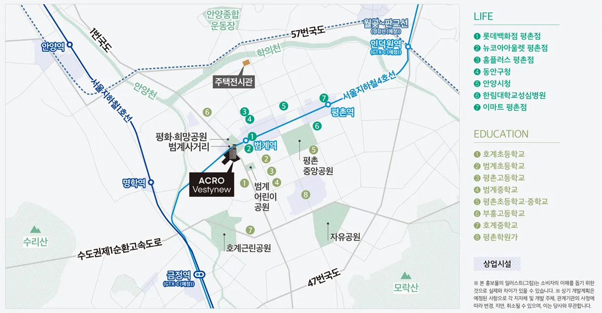 아크로베스티뉴는 대형 마트, 쇼핑몰, 영화관, 병원, 학교 등 다양한 편의 시설들이 가까워 입주민들에게 매우 편리한 생활 환경을 제공합니다. 안양시 주요 상업 지역과도 가까워 쇼핑, 외식, 문화생활을 즐기기 좋은 위치입니다.