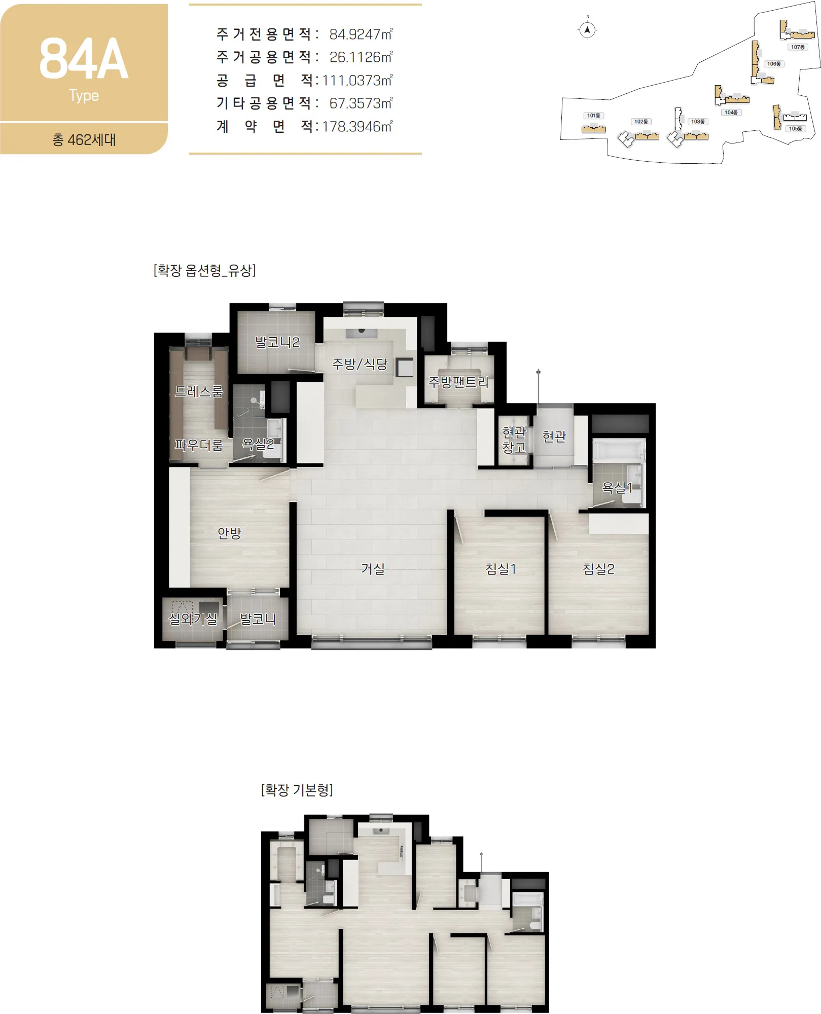 - 84㎡: 중형 평형대인 84㎡는 가족 구성원이 많은 가구에 적합합니다. 넓은 거실과 방을 갖추고 있어 넉넉한 생활공간을 제공합니다. 이러한 중형 평형은 장기적인 주거를 계획하는 가구에게 인기가 있습니다.